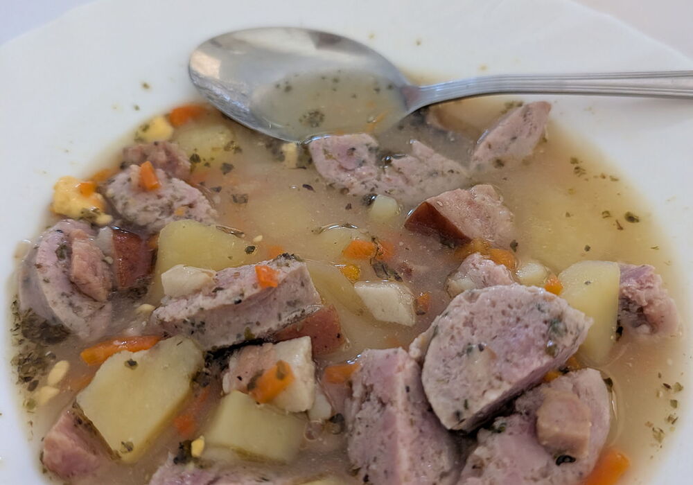 Nach der kreativen Arbeit wurden wir erneut mit traditionellen polnischen Ostergerichten verwöhnt. Besonders die saure Mehlsuppe mit reichhaltiger Wurstbeilage sorgte für neugierige Blicke und gute Stimmung. Nach Hauptgang und Dessert waren alle gut gestärkt.